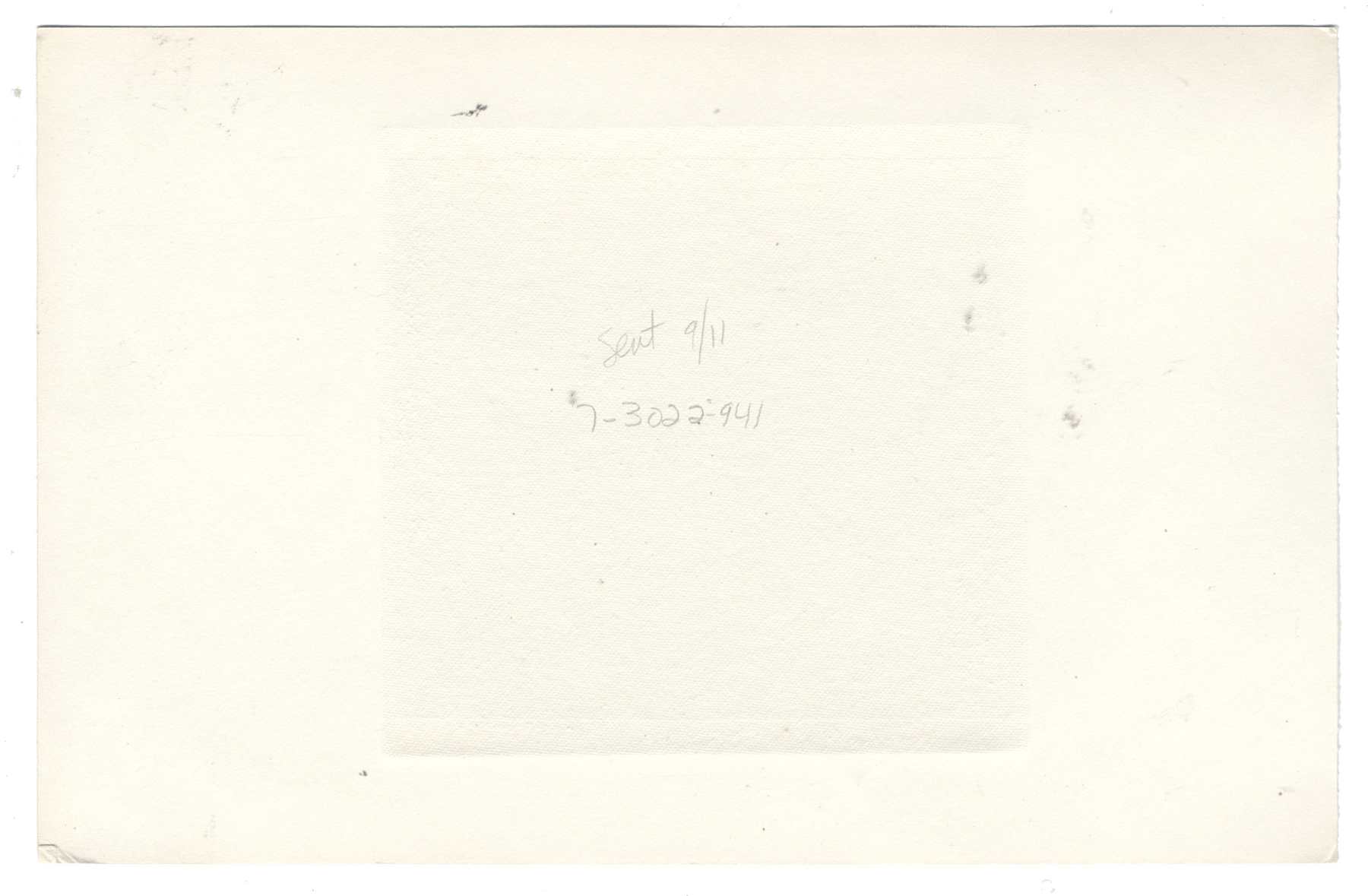 This proof itself measures 4 1/4" x 4 1/4" and is mounted on a cardboard backer that measures 9" x 6".