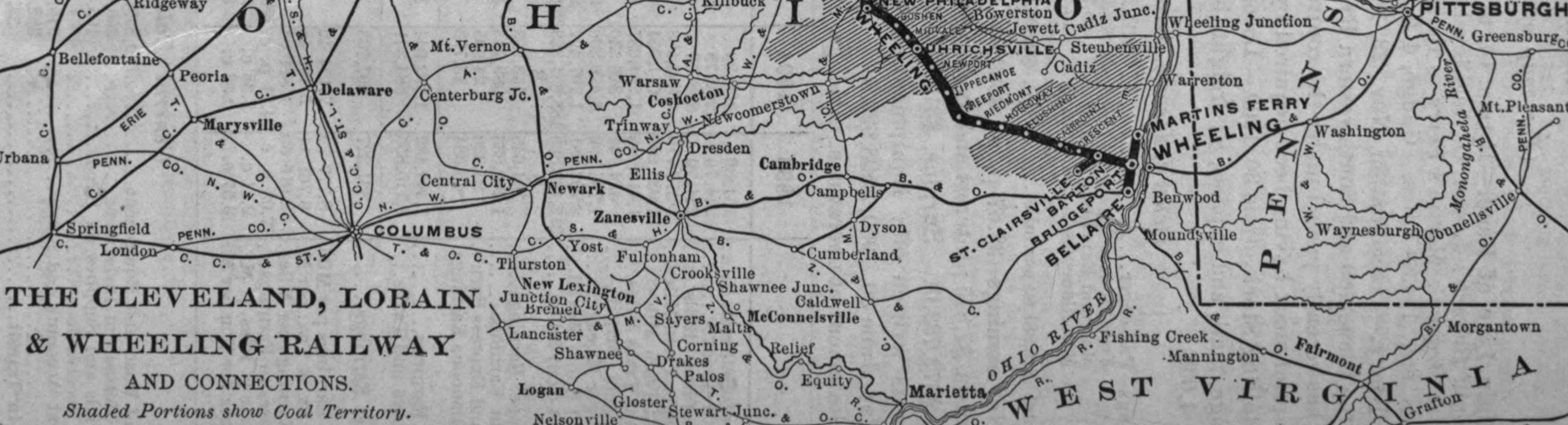 On March 21, 1877, the company filed a certificate for building a line from Uhrichsville, via Bridgeport, to a point on the Ohio river at West Wheeling. On March 1, 1883, the certificate of the Cleveland, Lorain and Wheeling Railroad Company was filed.