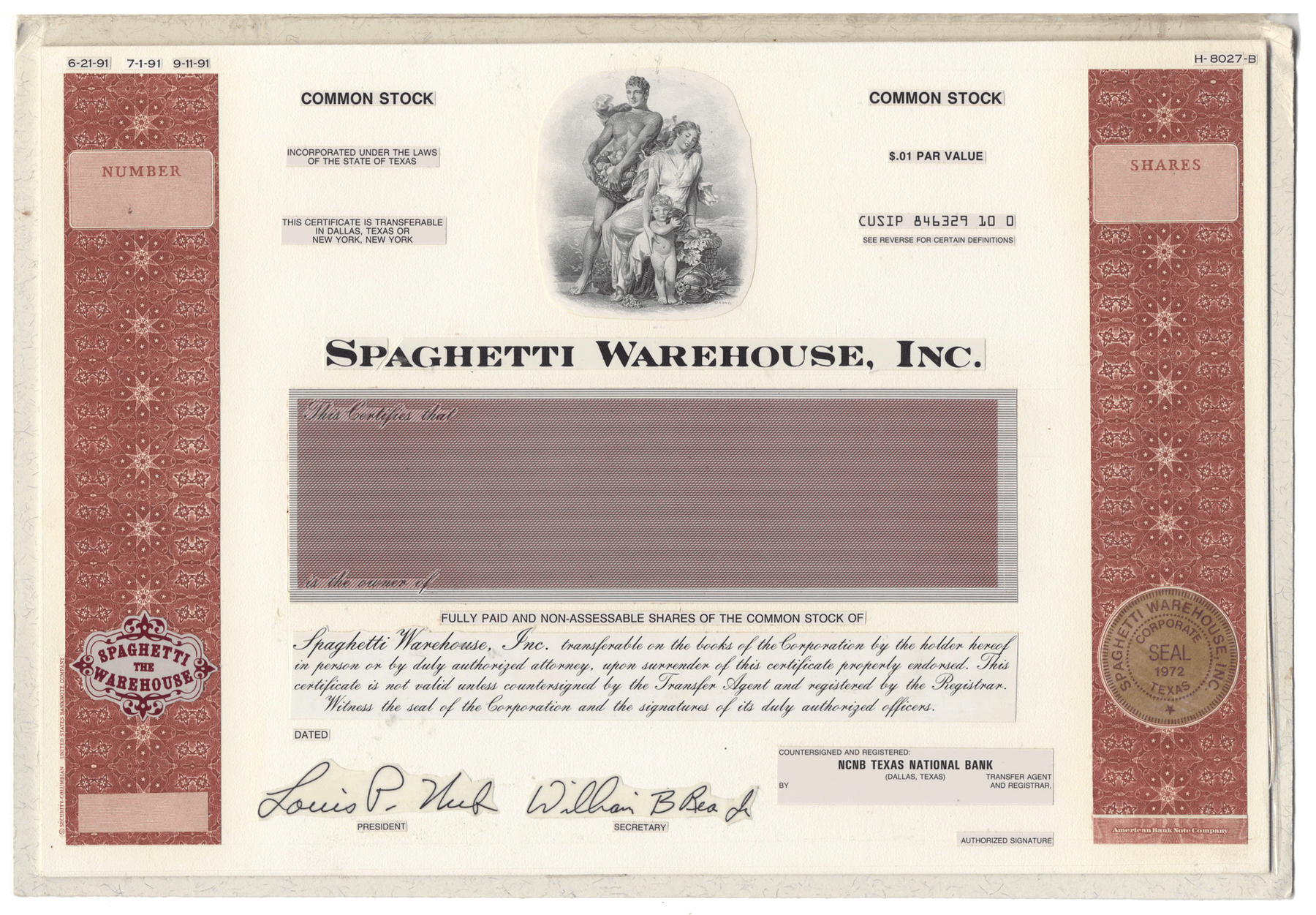 Spaghetti Warehouse, Inc., was acquired in 1998 by Consolidated Restaurant Cos. (a holding company of the private equity firm Cracken, Harkey & Co. L.L.C.). In June 2007, Consolidated Restaurants sold the chain to the Los Angeles–based investment firm Frandeli, Inc.