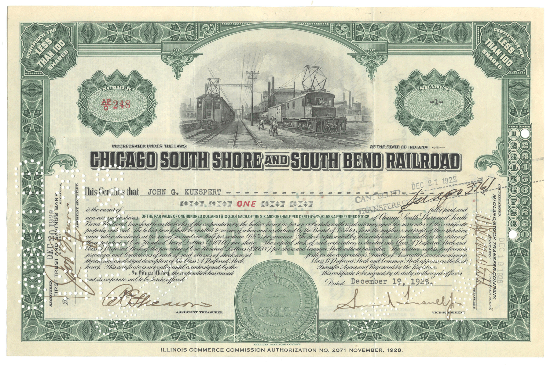 Chicago South Shore and South Bend Railroad (Signed by Samuel Insull, Jr.)