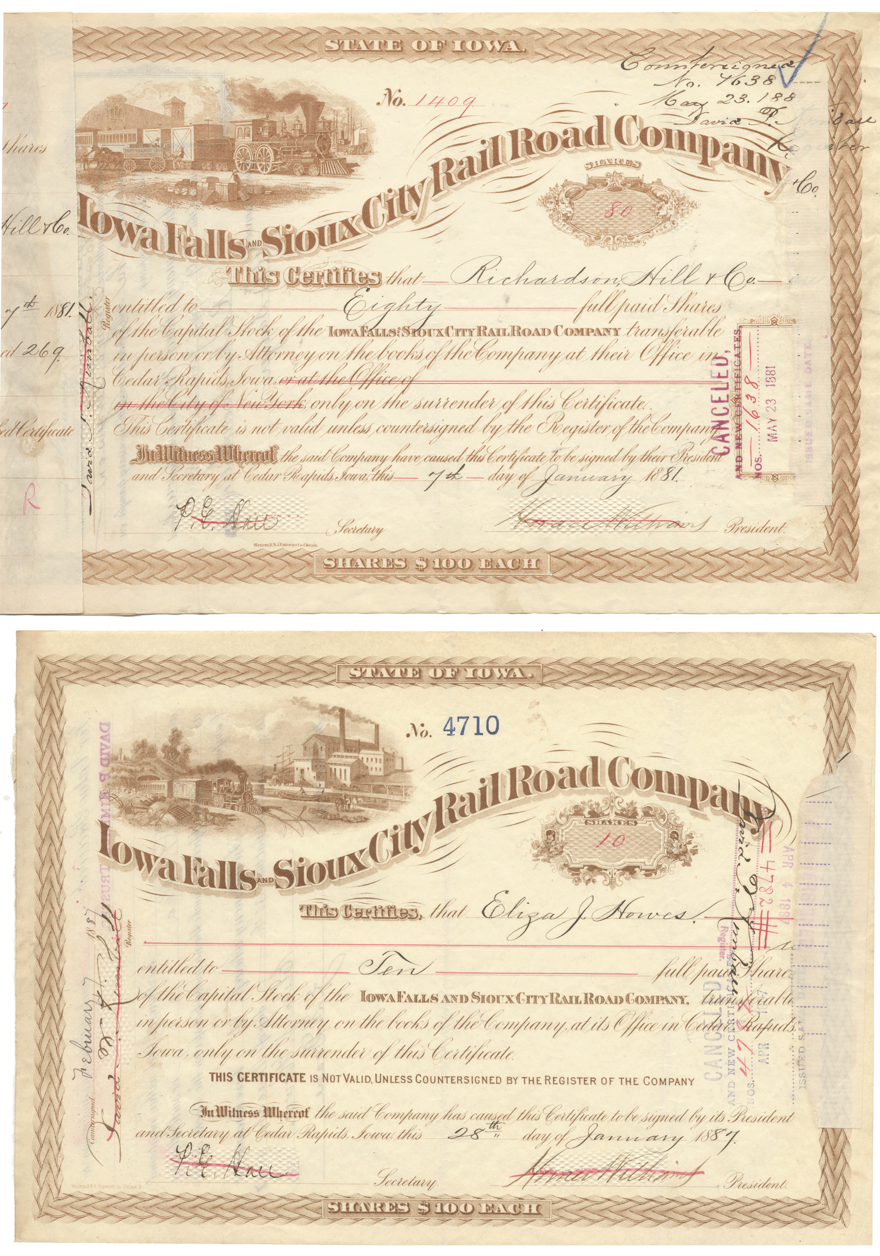 Iowa Falls and Sioux City Rail Road Company (LOT OF 4 PIECES)