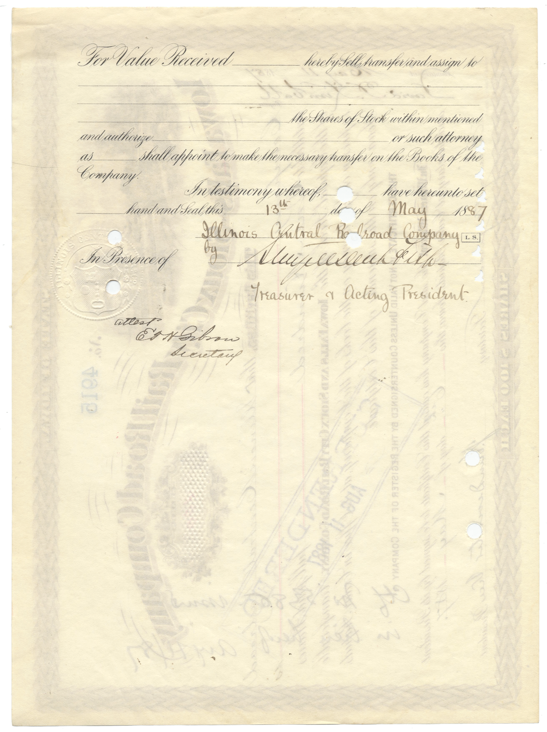 | Additional Details | Signed on verso by Stuyvesant Fish as the Treasurer and Acting President of the Illoinois Central Railroad |