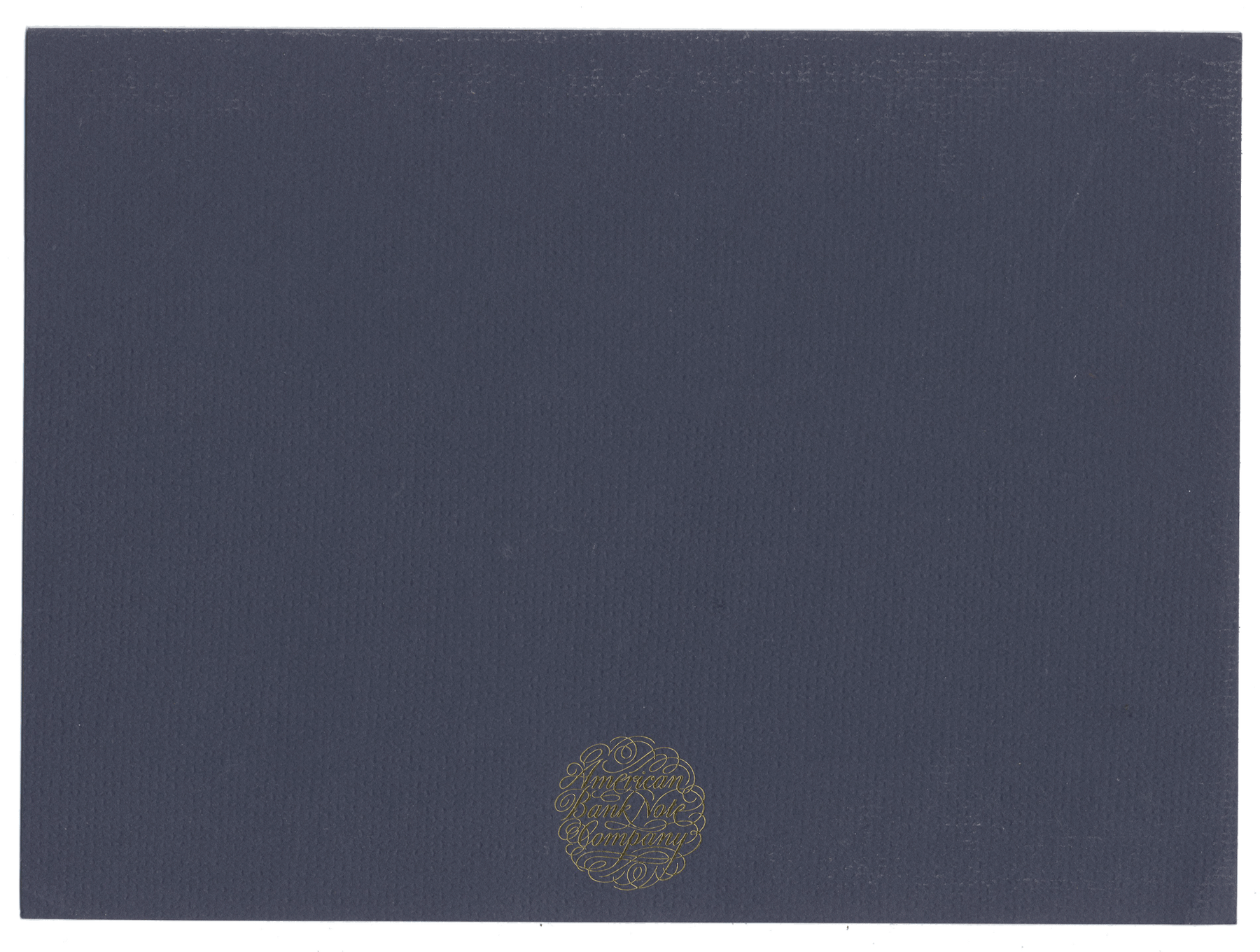 This proof is housed in a traditional blue 12" x 8 1/2" cardboard folder (see second picture, which is the front - or top - of the folder). The proof is adhered directly to the folder itself.