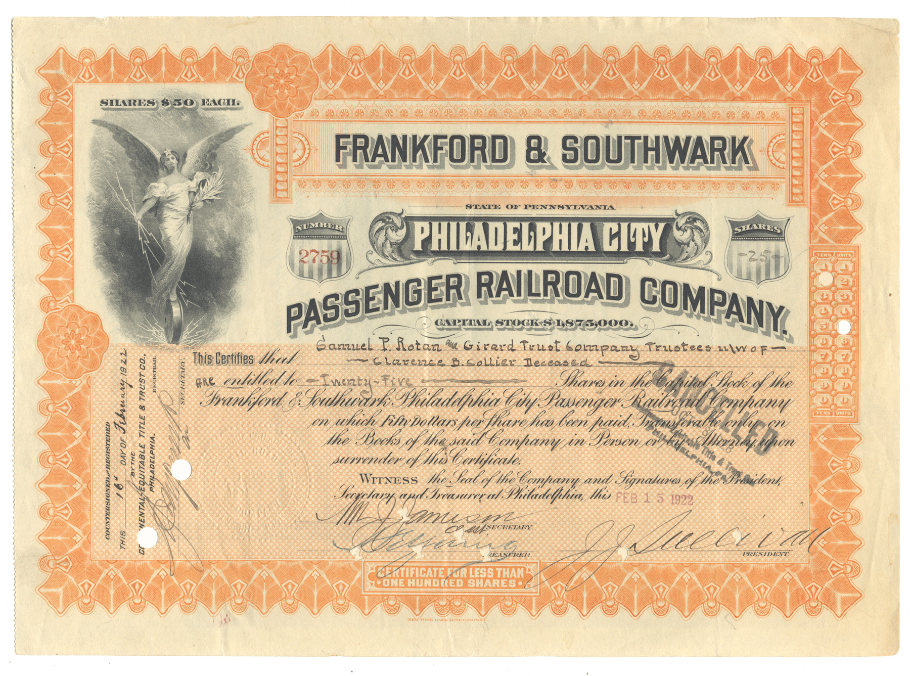 In April 1858, the Philadelphia & Delaware Railroad Company - which had beem incorporated four years earlier - became the Frankford & Southwark Philadelphia City Passenger Railroad Company. The line was the first of the many traction and motor companies incorporated to serve Philadelphia.
